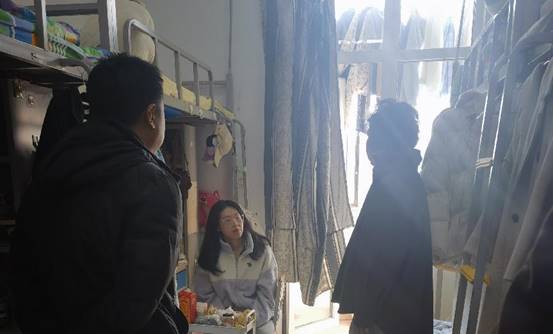 走访期间,老师们与同学们进行了深入交流,关切询问了同学们寒假期间的学习、生活情况,分享同学们假期中的见闻,嘱咐大家要以更加积极的心态投入到新学期的学习生活中。“春节过得怎么样?”“生活上有没有遇到什么困难?”“新学期有什么打算?”老师们悉心询问大家的学习生活情况、返校后的感受、未来的规划。一些同学也提出学习生活、实习就业方面的问题,老师们也跟同学们进行了深入的交流沟通与指导。