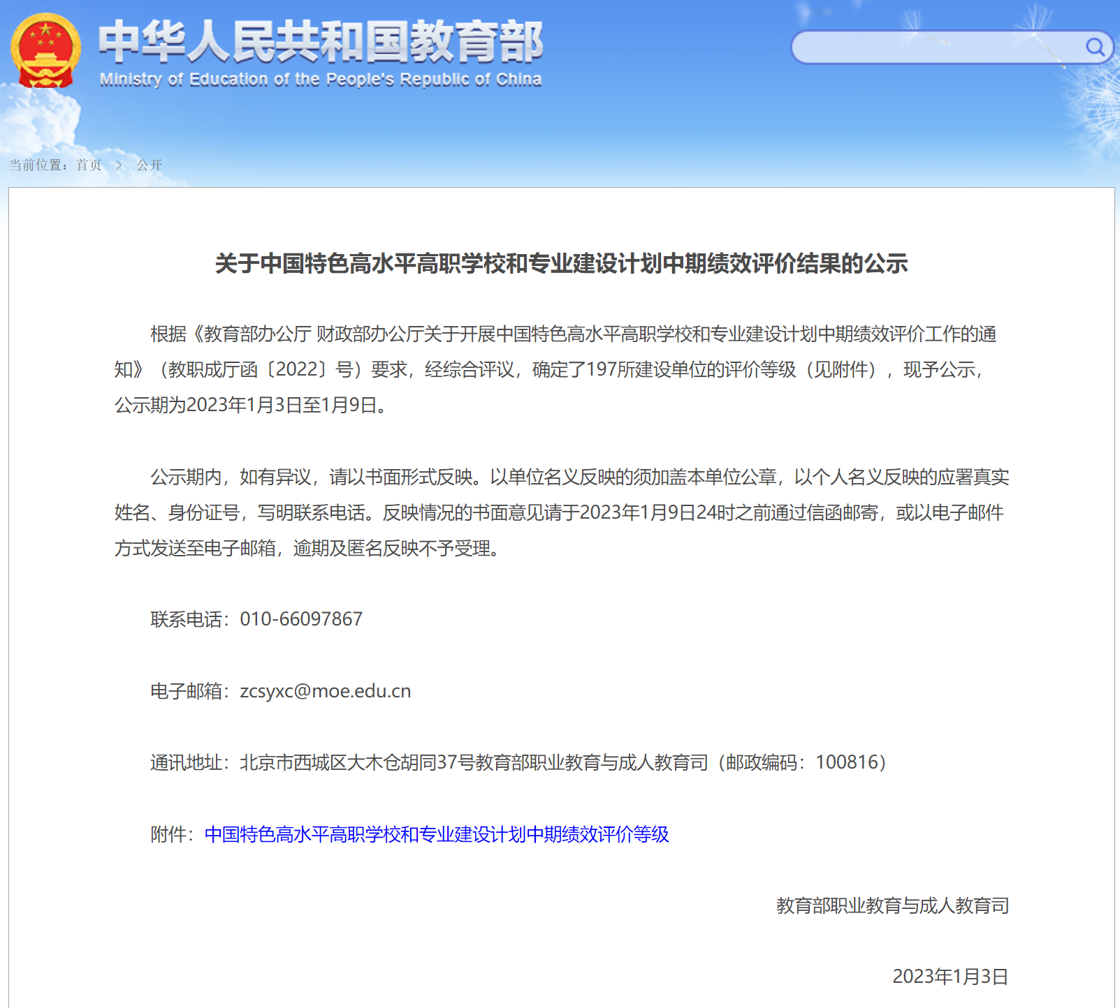 近期,教育部发布“关于中国特色高水平高职学校和专业建设计划中期绩效评价结果的公示”,根据《教育部办公厅 财政部办公厅关于开展中国特色高水平高职学校和专业建设计划中期绩效评价工作的通知》(教职成厅函〔2022〕号)要求,经院校自评、省级评价和两部综合评议等流程,学院在“双高计划”中期绩效评价中获评优秀。