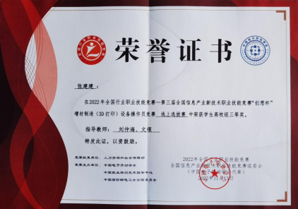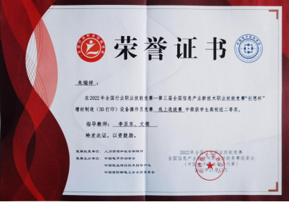 “2022年全国行业职业技能竞赛—第三届全国信息产业新技术职业技能竞赛—‘创想杯’增材制造(3D 打印)设备操作员竞赛”,来自全国192支参赛队参加了云端原创作品角逐。我校参赛选手朱瑞祥和张建建的自主创新设计作品“开锥栗神器”和“四爪机械手”,分别荣获高校组二等奖和三等奖。