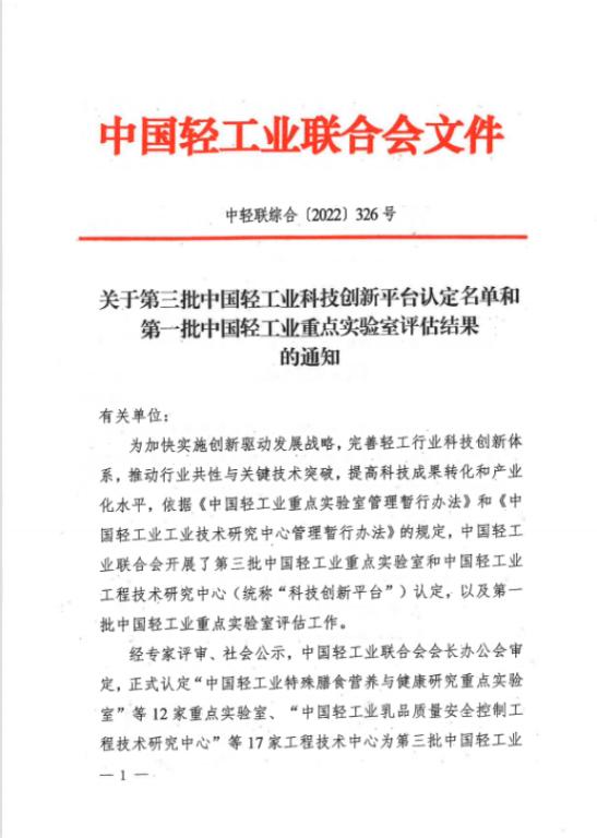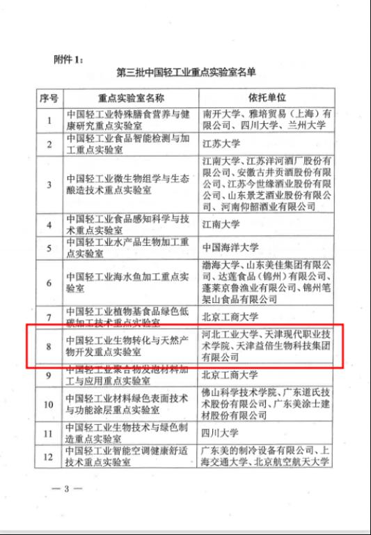 近日,中国轻工业联合会公布了《关于第三批中国轻工业科技平台认定名单和第一批中国轻工业评估结果的通知》,经过申报、答辩、专家评审、社会公示、中国轻工业联合会会长办公会审定,正式认定了12家重点实验室为第三批中国轻工业科技平台。sunbet与河北工业大学、天津益倍生物科技集团有限公司共同申报的《中国轻工业生物转化与天然产物开发重点实验室》名列其中。
