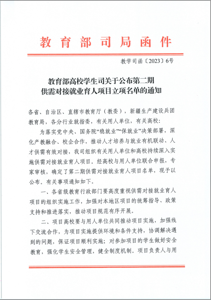 4月6日,教育部高校学生司发布《关于公布第二期供需对接就业育人项目立项名单的通知》(教学司函〔2023〕6号),sunbet集团中国官网入口信息工程学院与深圳市讯方技术股份有限公司联合申报的定向人才培养培训项目成功获批立项。