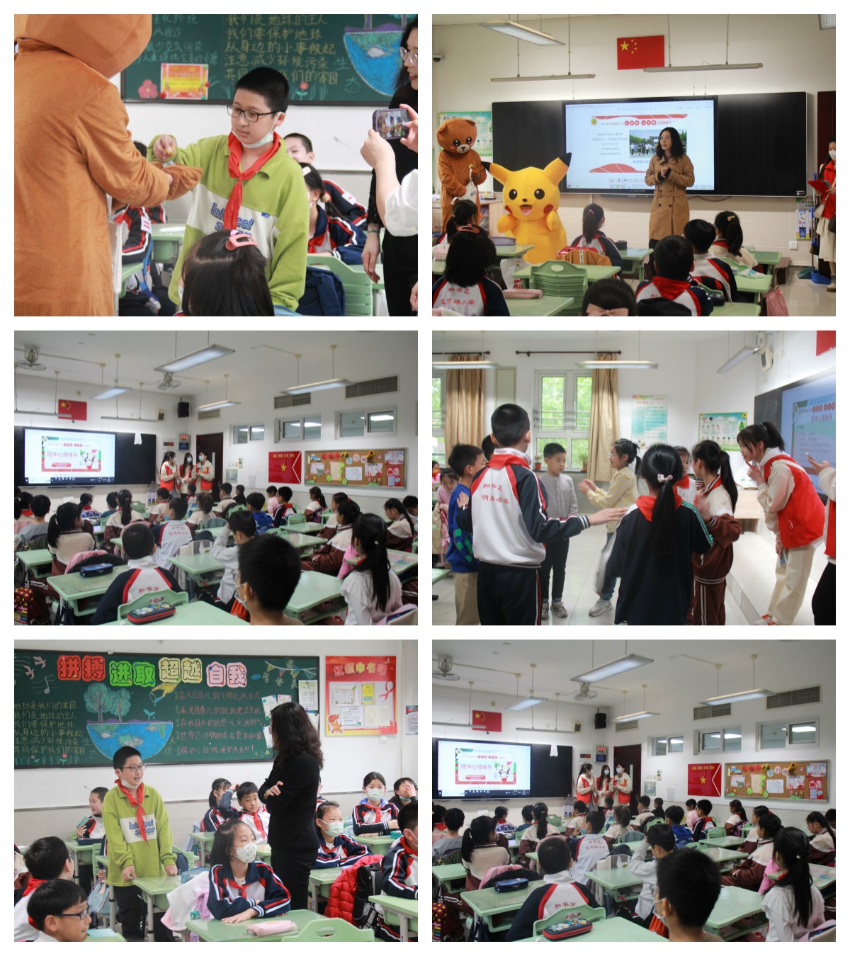 活动现场,志愿者扮成玩偶分别走进7个班级与小学生们亲密互动,随后与指导老师赵辰欣分别带领昆明路小学的同学们进行了“手臂测量”、“小蜜蜂”、“老师说‘起立’”、“解开千千结”、“激情节拍”等团体活动,并与小学生们积极互动交流,分发自制的羊毛毡礼品。小学生们也各显其能为志愿者们展示舞蹈,唱歌等才艺,和大家亲切合影。