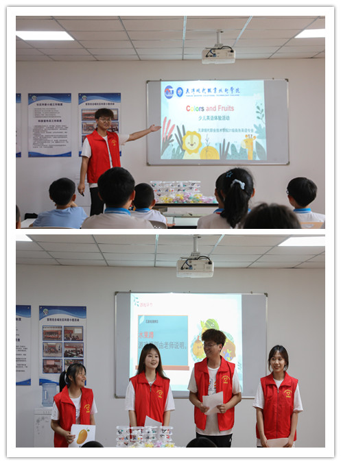 商务英语专业学生志愿者们通过精心设计编排,为社区小朋友们呈现了一堂精彩的英语体验活动。活动设计以趣味游戏为教学主线,通过播放音视频资料、实物教具体验等多种教学手段组织教学活动,让小朋友们在轻松愉快的互动氛围中体验到学习英语的乐趣,激发少年儿童学习英语的浓厚兴趣。