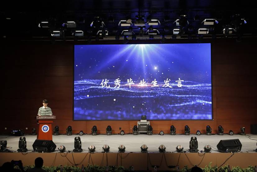 晚会上,优秀毕业生代表张益发言,希望毕业生们在人生道路上,有新的开始,新的起点,一路顺风,多回母校看看,愿同学们前程似锦,乘风破浪,无悔青春,将眼光不止拘泥于眼前,更着眼于未来,将自己的未来规划得更加详尽。