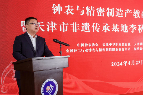 中国钟表协会理事长张宏光代表中国钟表协会对产教融合实践中心和李秋生工作室揭牌表示热烈祝贺。他表示,现代学院牵头成立“全国轻工行业钟表与精密制造职业教育集团”以来,深入开展钟表行业产教融合育人实践,连续两次承办“全国机械手表维修工职业技能竞赛天津预选赛”,为钟表行业培养了大批复合型高端制表人才,产教融合工作卓有成效。他还说,中国钟表协会将一如既往地支持现代学院发展,希望学院在补短板、促升级、增后劲方面为行业高质量发展提供更多智力支撑和人才保障。