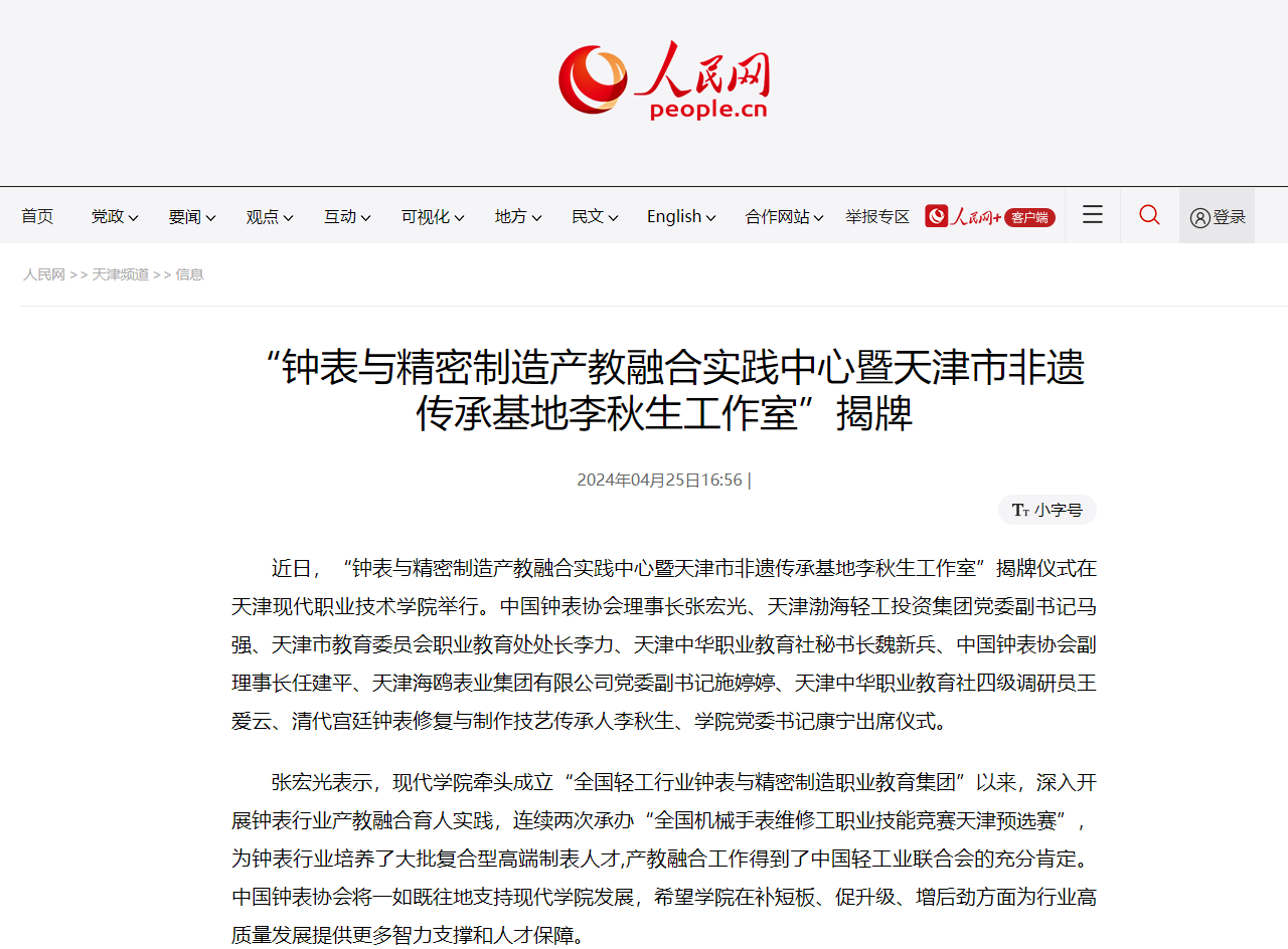 近日,“钟表与精密制造产教融合实践中心暨天津市非遗传承基地李秋生工作室”揭牌仪式在sunbet集团中国官网入口举行。中国钟表协会理事长张宏光、天津渤海轻工投资集团党委副书记马强、天津市教育委员会职业教育处处长李力、天津中华职业教育社秘书长魏新兵、中国钟表协会副理事长任建平、天津海鸥表业集团有限公司党委副书记施婷婷、天津中华职业教育社四级调研员王爱云、清代宫廷钟表修复与制作技艺传承人李秋生、学院党委书记康宁出席仪式。