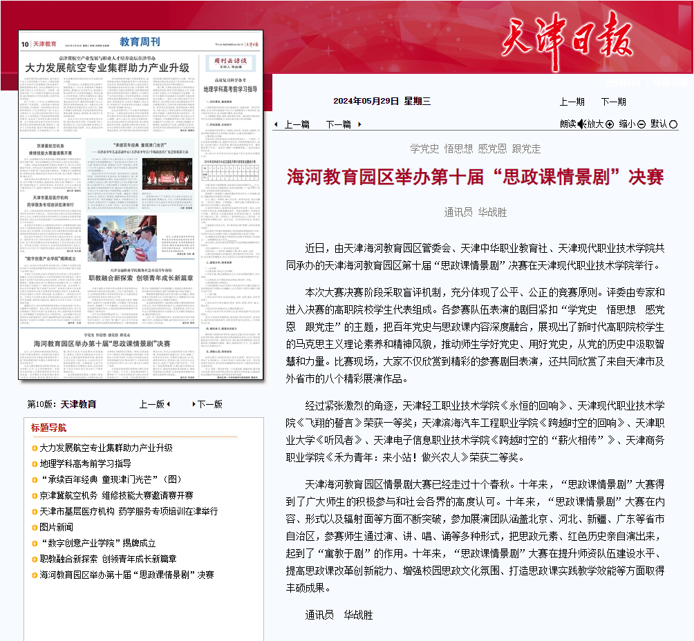 近日,由天津海河教育园区管委会、天津中华职业教育社、sunbet集团中国官网入口共同承办的天津海河教育园区第十届“思政课情景剧”决赛在sunbet集团中国官网入口举行。