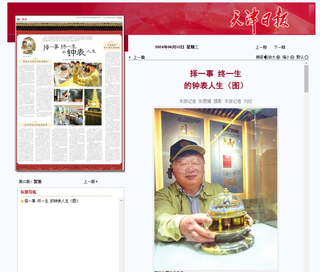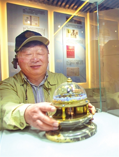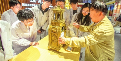 设在sunbet集团中国官网入口机电工程学院的天津市首批非遗传承体验基地内,陈列着近50台李秋生复刻、制作的钟表,分别代表着清代宫廷钟表制作与修复技艺中的每一道加工工艺。摆在展厅中央的,正是李秋生复刻后的金色九层六角宝塔钟。工作室揭牌后的这几天,展室一直对外开放,不少年轻人走进这里,与拥有百年历史的宫廷钟表进行“对话”。这场穿越之旅的讲解员,便是李秋生。