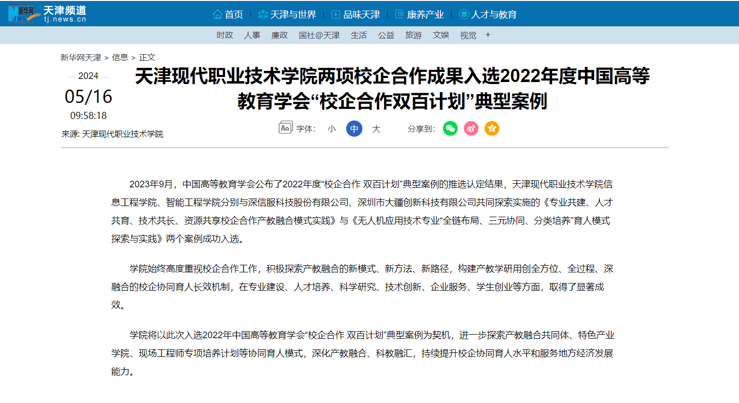 2023年9月,中国高等教育学会公布了2022年度“校企合作 双百计划”典型案例的推选认定结果,sunbet集团中国官网入口信息工程学院、智能工程学院分别与深信服科技股份有限公司、深圳市大疆创新科技有限公司共同探索实施的《专业共建、人才共育、技术共长、资源共享校企合作产教融合模式实践》与《无人机应用技术专业“全链布局、三元协同、分类培养”育人模式探索与实践》两个案例成功入选。