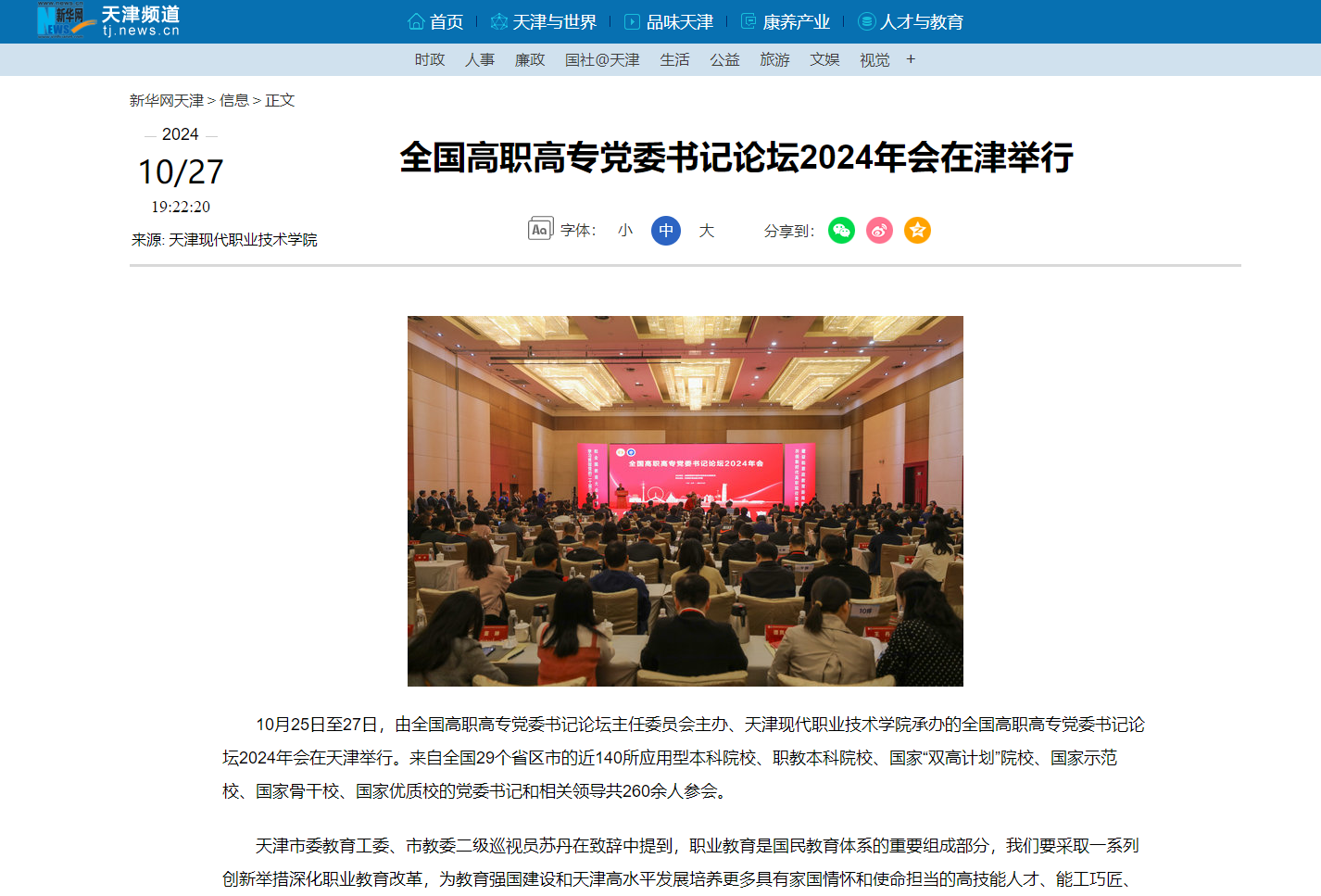 10月25日至27日,由全国高职高专党委书记论坛主任委员会主办、sunbet集团中国官网入口承办的全国高职高专党委书记论坛2024年会在天津举行。来自全国29个省区市的近140所应用型本科院校、职教本科院校、国家“双高计划”院校、国家示范校、国家骨干校、国家优质校的党委书记和相关领导共260余人参会。