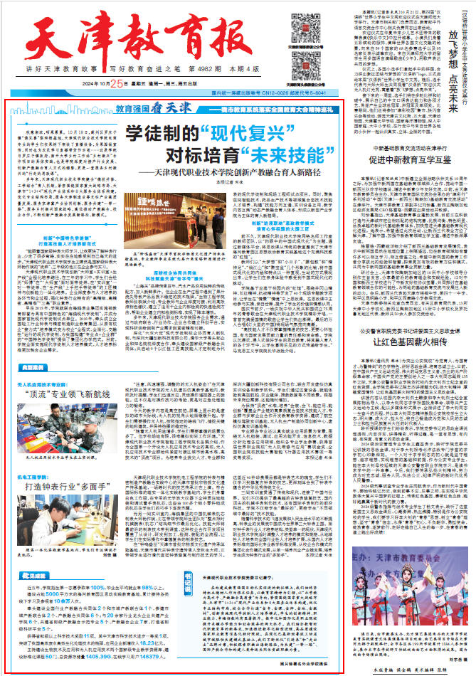 在向建成教育强国目标扎实迈进的新征程上,我们始终坚持把立德树人作为根本任务,以教育家精神为引领,以“办学能力高水平、产教融合高质量”为导向,紧密围绕国家重大战略布局、天津市“1+3+4”现代产业体系和8 大服务业体系构建,优化专业结构布局,校企合作打造“金专、金课、金师、金地、金教材”,创新实施现代学徒制人才培养模式,学生的创新精神、职业能力、幸福指数均有显著提升。数字化和国际化是职业院校提升关键办学能力和社会服务的两大抓手。我们结合数智时代职教变革的新要求,加速推进数字化转型进程,高品质建设国家职业教育信息化标杆院校。在深化巴基斯坦鲁班工坊省域市域联动共建模式基础上,我们不断优化“引进来”和“走出去”品牌方案,积极探索职教出海新路径,为共建“一带一路”、国际产能合作和构建人类命运共同体贡献职教力量。