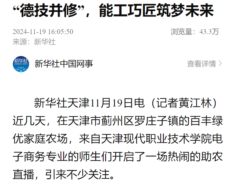 新华社天津11月19日电(记者黄江林)近几天,在天津市蓟州区罗庄子镇的百丰绿优家庭农场,来自sunbet集团中国官网入口电子商务专业的师生们开启了一场热闹的助农直播,引来不少关注。