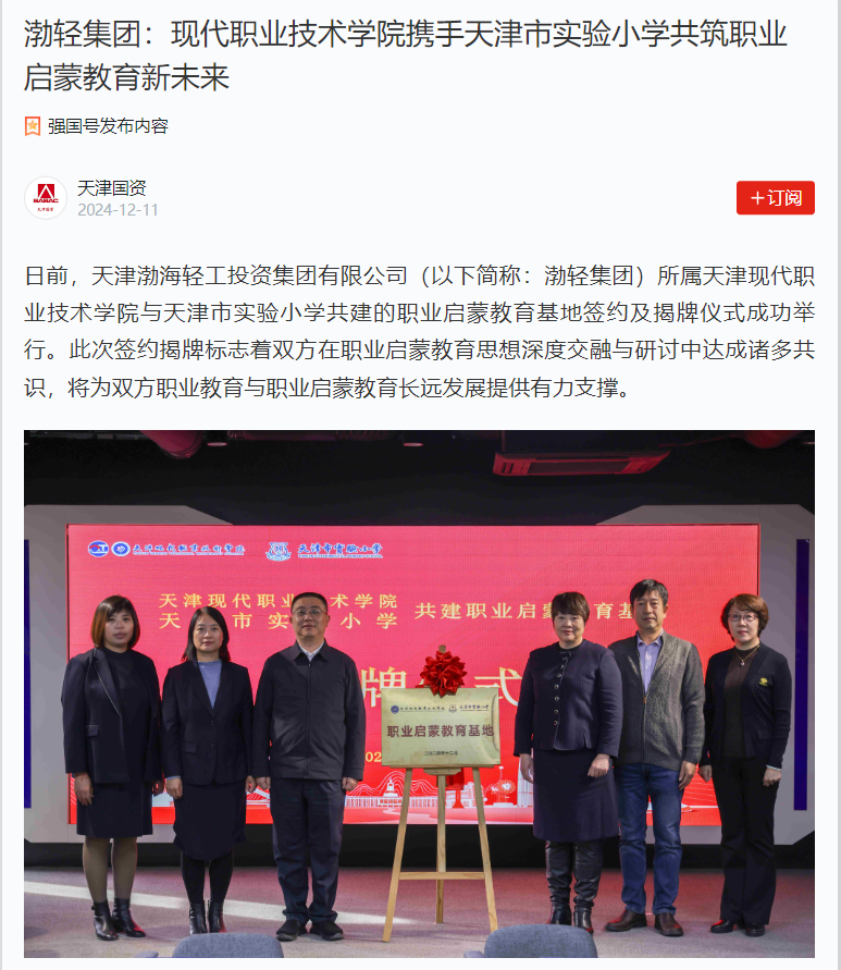 日前,天津渤海轻工投资集团有限公司(以下简称:渤轻集团)所属sunbet集团中国官网入口与天津市实验小学共建的职业启蒙教育基地签约及揭牌仪式成功举行。此次签约揭牌标志着双方在职业启蒙教育思想深度交融与研讨中达成诸多共识,将为双方职业教育与职业启蒙教育长远发展提供有力支撑。