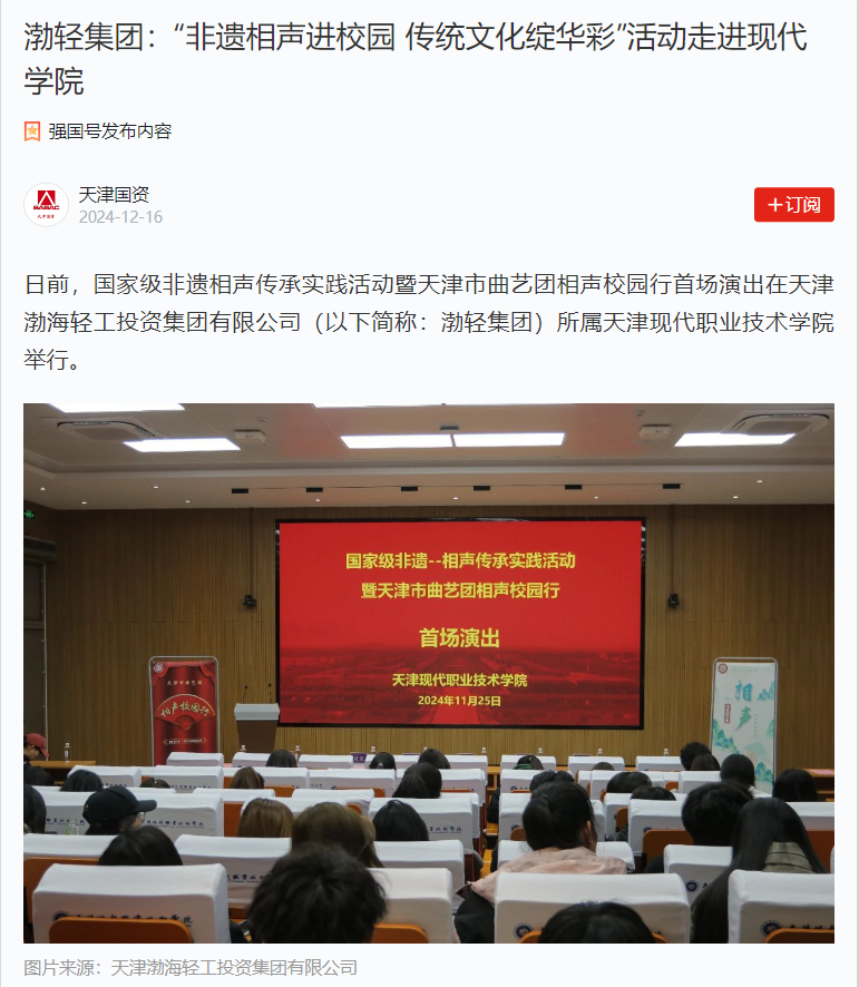 日前,国家级非遗相声传承实践活动暨天津市曲艺团相声校园行首场演出在天津渤海轻工投资集团有限公司(以下简称:渤轻集团)所属sunbet集团中国官网入口举行。