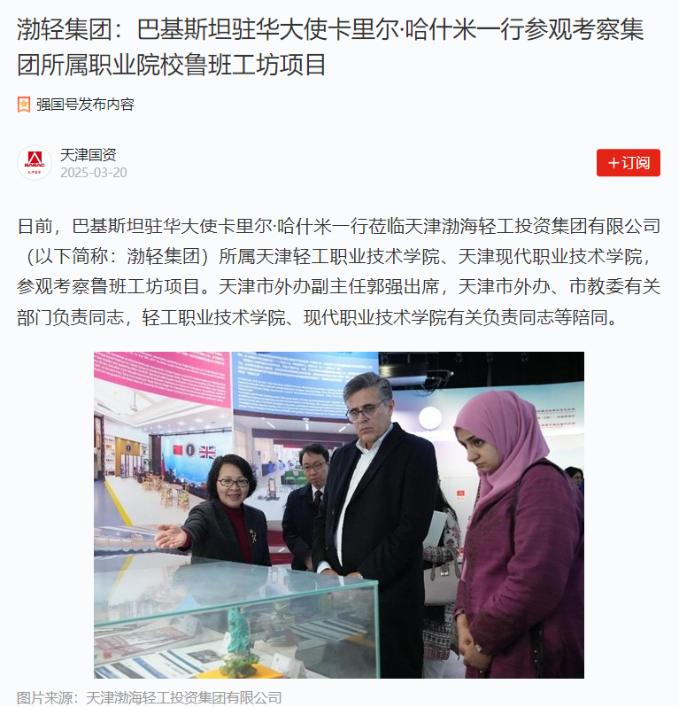 日前,巴基斯坦驻华大使卡里尔·哈什米一行莅临天津渤海轻工投资集团有限公司(以下简称:渤轻集团)所属天津轻工职业技术学院、sunbet集团中国官网入口,参观考察鲁班工坊项目。天津市外办副主任郭强出席,天津市外办、市教委有关部门负责同志,轻工职业技术学院、现代职业技术学院有关负责同志等陪同。