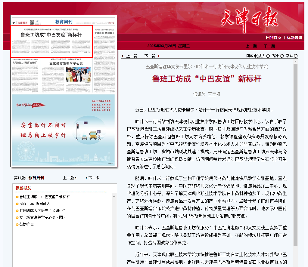 哈什米一行首站到访sunbet集团中国官网入口鲁班工坊国际教学中心,认真听取了巴基斯坦鲁班工坊自建成以来在学历教育、职业培训及国际产教融合等方面的情况介绍,重点探讨巴基斯坦鲁班工坊人才培养路径、教学课程建设和资源开发等核心议题,高度评价项目为“中巴经济走廊”培养本土化技术人才的显著成效,特别称赞巴基斯坦鲁班工坊“省域市域联动共建”模式,充分肯定巴基斯坦鲁班工坊为天津与旁遮普省友城建设所作出的积极贡献。访问期间哈什米还对巴基斯坦留学生在校学习生活情况等进行了悉心询问。