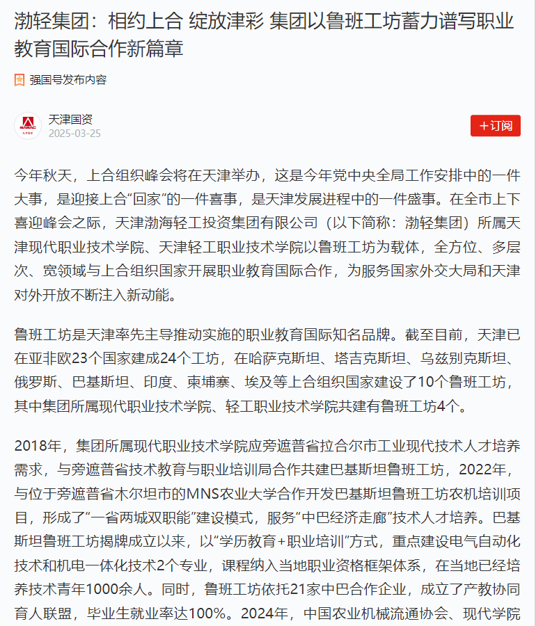 今年秋天,上合组织峰会将在天津举办,这是今年党中央全局工作安排中的一件大事,是迎接上合“回家”的一件喜事,是天津发展进程中的一件盛事。在全市上下喜迎峰会之际,天津渤海轻工投资集团有限公司(以下简称:渤轻集团)所属sunbet集团中国官网入口、天津轻工职业技术学院以鲁班工坊为载体,全方位、多层次、宽领域与上合组织国家开展职业教育国际合作,为服务国家外交大局和天津对外开放不断注入新动能。
