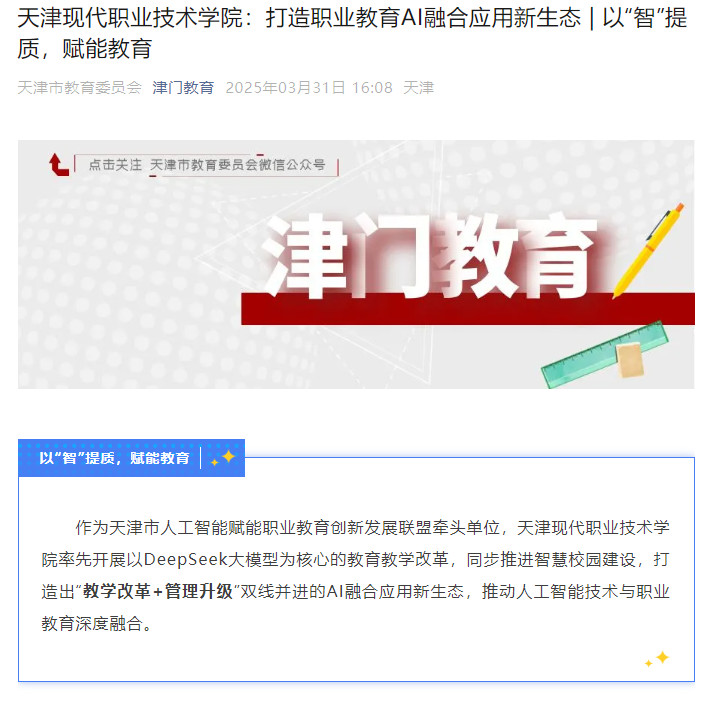 作为天津市人工智能赋能职业教育创新发展联盟牵头单位,sunbet集团中国官网入口率先开展以DeepSeek大模型为核心的教育教学改革,同步推进智慧校园建设,打造出“教学改革+管理升级”双线并进的AI融合应用新生态,推动人工智能技术与职业教育深度融合。