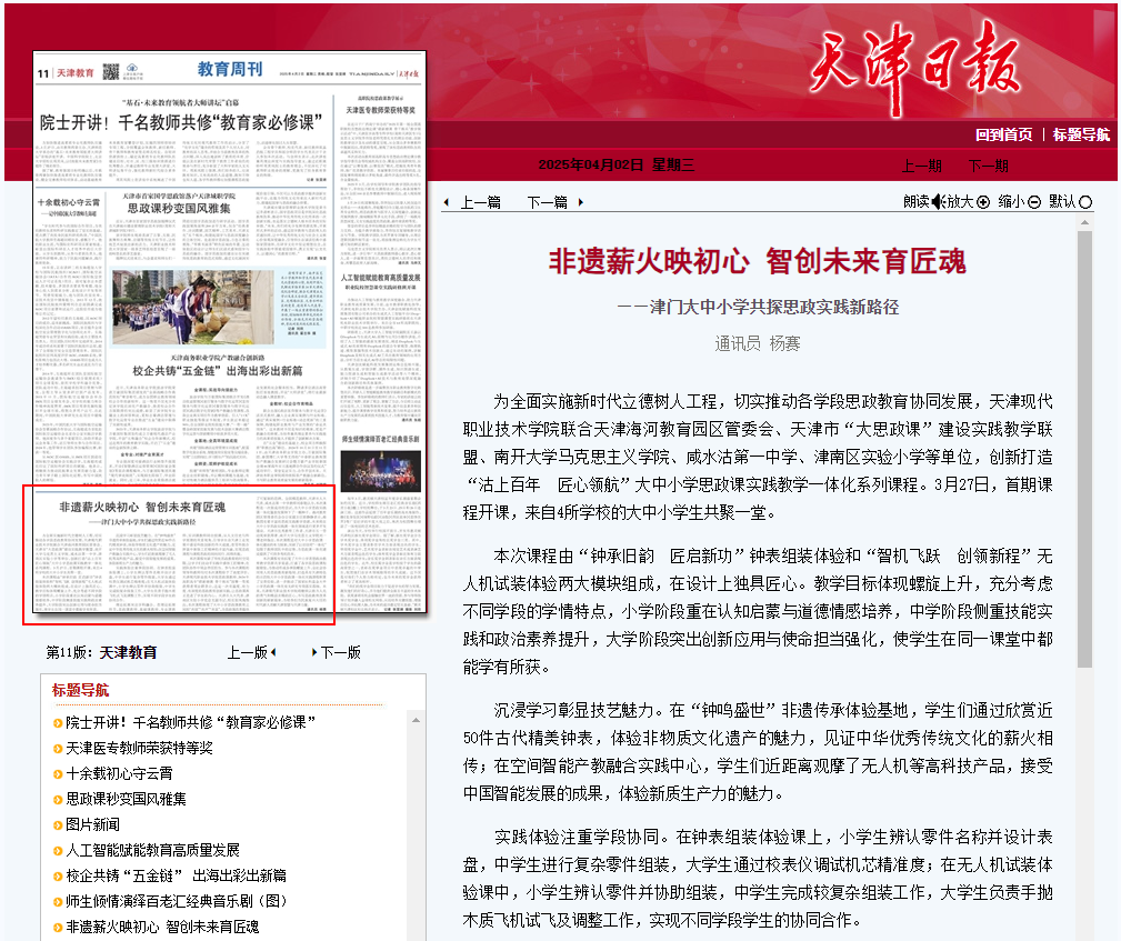 本次课程突破了传统思政教育的时空局限,让学子们在动手实践中感悟工匠精神,在团队协作中领会责任担当。参与本次课程的领导和教师均对本次课程给予了高度评价。sunbet集团中国官网入口思政课教师、2024年高职高专“萌新磨课 骨干练兵”国赛一等奖获得者周业群表示,这是一次有温度、有力度、有深度的思政教育创新实践,让思政课真正走进了学生的内心。天津市人大代表、津南区实验小学党总支副书记、校长张凤瑰指出,本次课程体现了大中小学思政课教育之间的“共情”“共声”“共享”,为思政课改革提供了可复制的范例。全国模范教师、天津市人大代表、咸水沽第一中学教师刘春艳认为,本次课程是一次很成功的尝试,为大中小学思政实践课一体化蓬勃发展种下了一颗种子。海河教育园区管理委员会办公室副主任郎静静表示,海教园有着丰富的思政实践教学资源,未来将在大中小学思政实践课一体化领域进行更多开发建设。天津市优秀教育工作者、天津市五一劳动奖章获得者、南开大学马克思主义学院刘一博老师指出,本次课程是对大中小学思政课一体化建设的有力探索,突破了以往仅将“一体化”局限于教师团队中的定势,为思政课一体化建设提供了可供参考的范本。