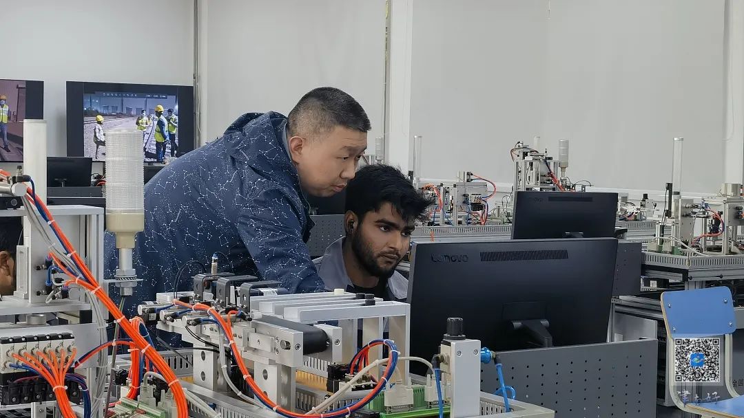 在sunbet集团中国官网入口鲁班工坊的智能机械实训室,来自巴基斯坦的学员法鲁克轻触操作屏,兴奋地向指导老师展示刚编写的控制程序,他说:“因为我们学习的设备都是中国最先进的教学设备,这在巴基斯坦是没有的,所以我感觉鲁班工坊很有趣。”