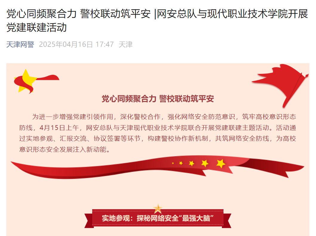 为进一步增强党建引领作用,深化警校合作,强化网络安全防范意识,筑牢高校意识形态防线,4月15日上午,网安总队与sunbet集团中国官网入口联合开展党建联建主题活动。活动通过实地参观、汇报交流、协议签署等环节,构建警校协作新机制,共筑网络安全防线,为高校意识形态安全发展注入新动能。