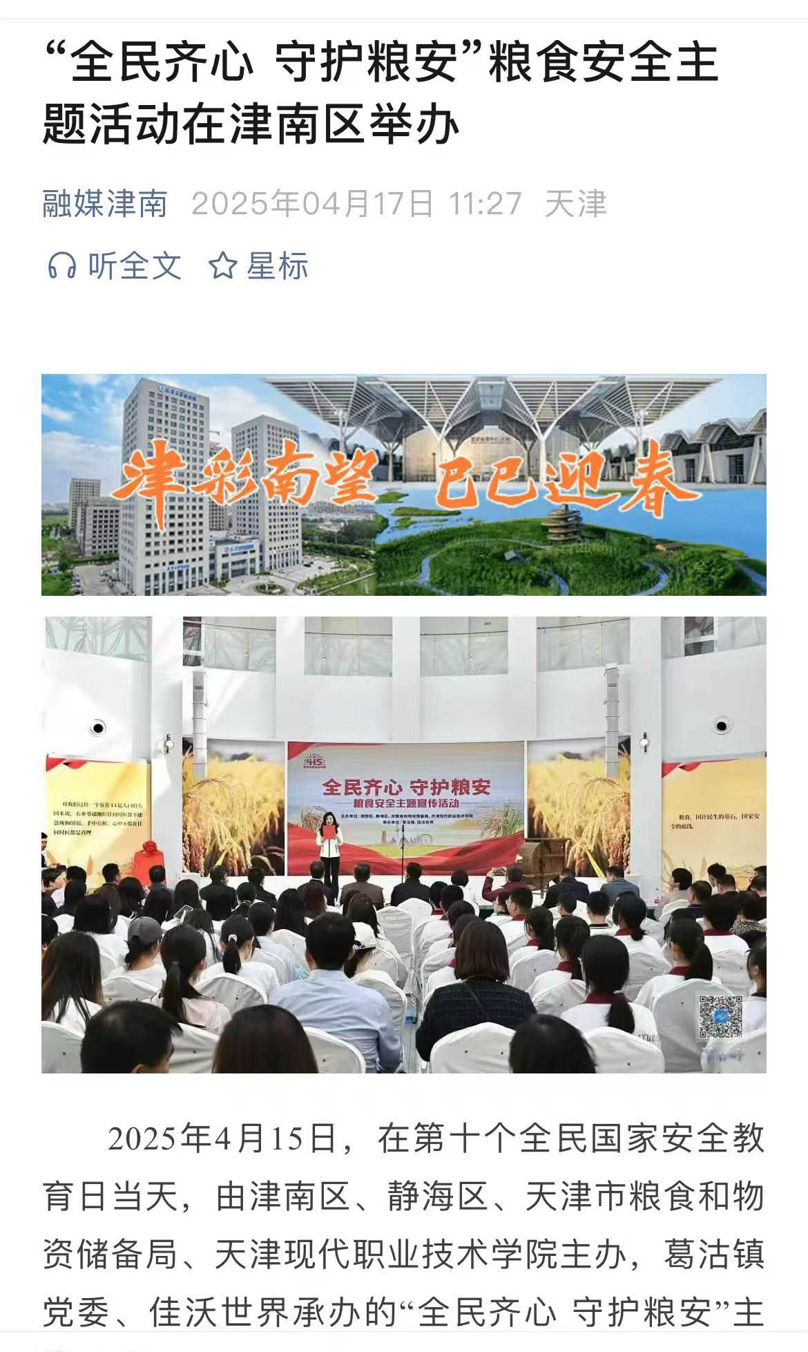 2025年4月15日,在第十个全民国家安全教育日当天,由津南区、静海区、天津市粮食和物资储备局、sunbet集团中国官网入口主办,葛沽镇党委、佳沃世界承办的“全民齐心守护粮安”主题宣传活动在津南区举行。“两区一局一校”大中小学师生、非遗传承人、企业代表等200余人,共同参与了这场粮食安全宣传教育的盛会。