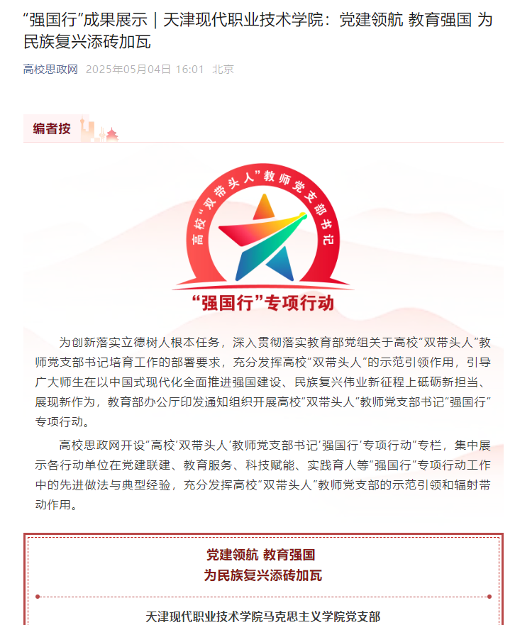 高校思政网开设“高校‘双带头人’教师党支部书记‘强国行’专项行动”专栏,集中展示各行动单位在党建联建、教育服务、科技赋能、实践育人等“强国行”专项行动工作中的先进做法与典型经验,充分发挥高校“双带头人”教师党支部的示范引领和辐射带动作用。