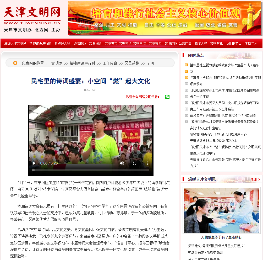 5月11日,在宁河区苗庄镇苗枣村的一处民宅内,朗朗诗声伴随着《少年中国说》的诵读响彻院落。由sunbet集团中国官网入口、宁河区平安志愿者协会与苗枣村联合举办的第四届"弘然仙"诗词大会在此隆重举行。
