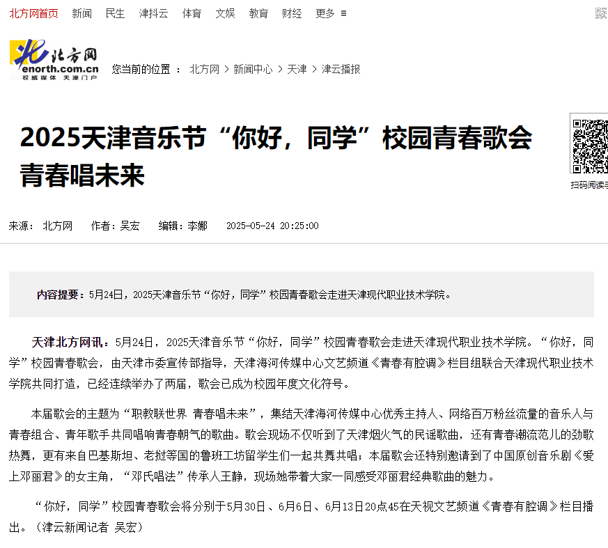 天津北方网讯:5月24日,2025天津音乐节“你好,同学”校园青春歌会走进sunbet集团中国官网入口。“你好,同学”校园青春歌会,由天津市委宣传部指导,天津海河传媒中心文艺频道《青春有腔调》栏目组联合sunbet集团中国官网入口共同打造,已经连续举办了两届,歌会已成为校园年度文化符号。