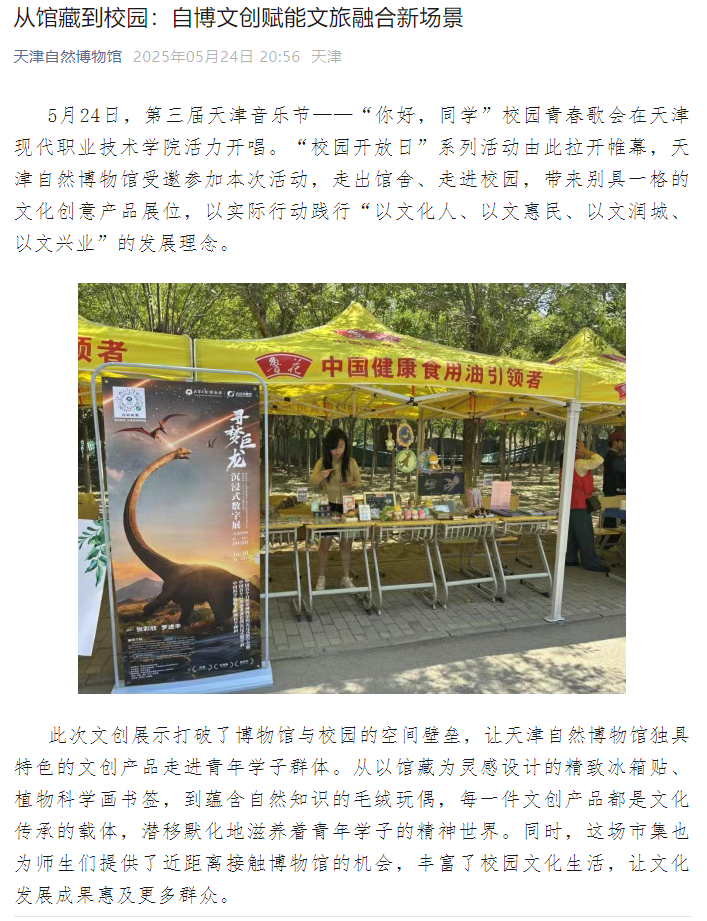 5月24日,第三届天津音乐节——“你好,同学”校园青春歌会在sunbet集团中国官网入口活力开唱。“校园开放日”系列活动由此拉开帷幕,天津自然博物馆受邀参加本次活动,走出馆舍、走进校园,带来别具一格的文化创意产品展位,以实际行动践行“以文化人、以文惠民、以文润城、以文兴业”的发展理念。