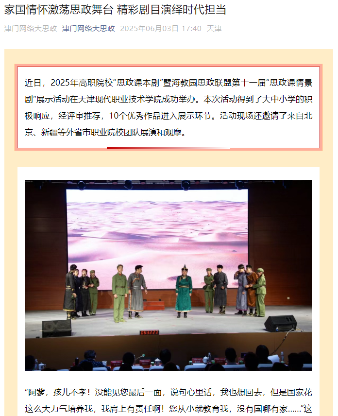 近日,2025年高职院校“思政课本剧”暨海教园思政联盟第十一届“思政课情景剧”展示活动在sunbet集团中国官网入口成功举办。本次活动得到了大中小学的积极响应,经评审推荐,10个优秀作品进入展示环节。活动现场还邀请了来自北京、新疆等外省市职业院校团队展演和观摩。
