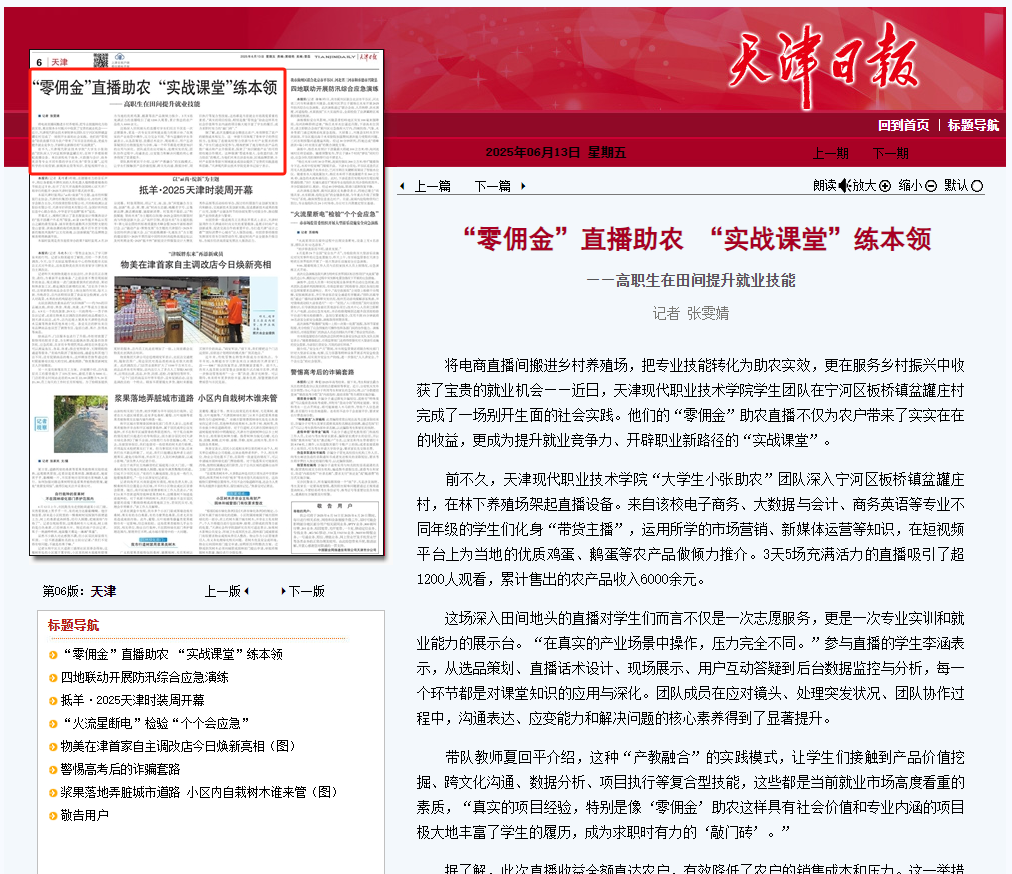 将电商直播间搬进乡村养殖场,把专业技能转化为助农实效,更在服务乡村振兴中收获了宝贵的就业机会——近日,sunbet集团中国官网入口学生团队在宁河区板桥镇盆罐庄村完成了一场别开生面的社会实践。他们的“零佣金”助农直播不仅为农户带来了实实在在的收益,更成为提升就业竞争力、开辟职业新路径的“实战课堂”。
