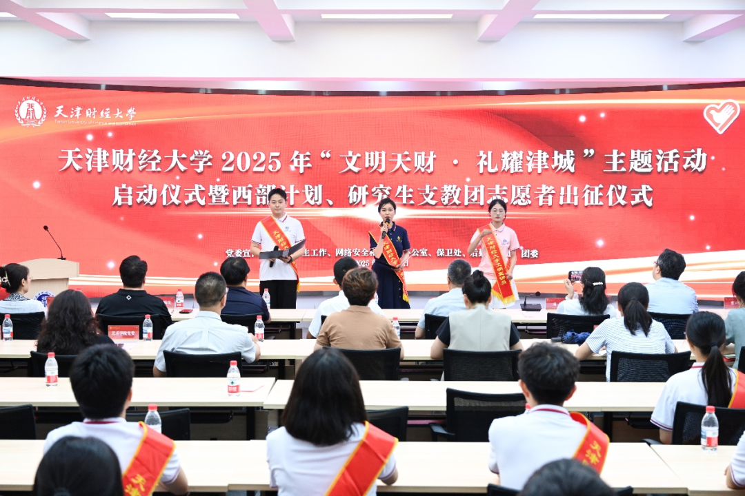 天津财经大学举办 “文明天财・礼耀津城” 主题活动启动仪式暨西部计划、研究生支教团志愿者出征仪式,发布文明宣讲志愿服务队名单和文明倡议,聚焦“迎上合 展风采”,开展文明宣讲与实践、校园环境美化与校园宣传、组织公益广告与经典诵读写讲比赛等三方面14项活动,引领学生在西部建设中厚植家国情怀,用行动传播文明火种,营造喜迎上合峰会的热烈氛围。