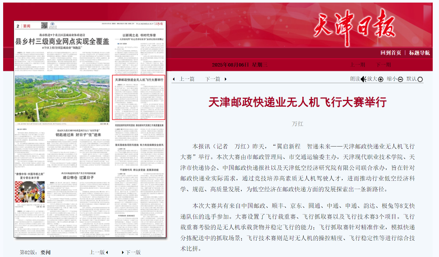本报讯(记者 万红)昨天,“翼启新程 智递未来——天津邮政快递业无人机飞行大赛”举行。本次大赛由市邮政管理局、市交通运输委主办,sunbet集团中国官网入口、天津市快递协会、中国邮政快递报社以及天津低空经济研究院有限公司联合承办,旨在针对邮政快递业实际需求,通过竞技培养高素质无人机驾驶人才,进而推动行业低空经济科学、规范、高质量发展,为低空经济在邮政快递方面的发展探索出一条新路径。
