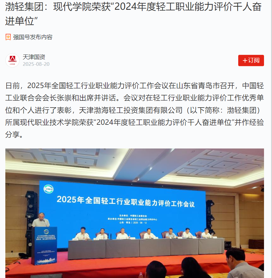 日前,2025年全国轻工行业职业能力评价工作会议在山东省青岛市召开,中国轻工业联合会会长张崇和出席并讲话。会议对在轻工行业职业能力评价工作优秀单位和个人进行了表彰,天津渤海轻工投资集团有限公司(以下简称:渤轻集团)所属现代职业技术学院荣获“2024年度轻工职业能力评价千人奋进单位”并作经验分享。