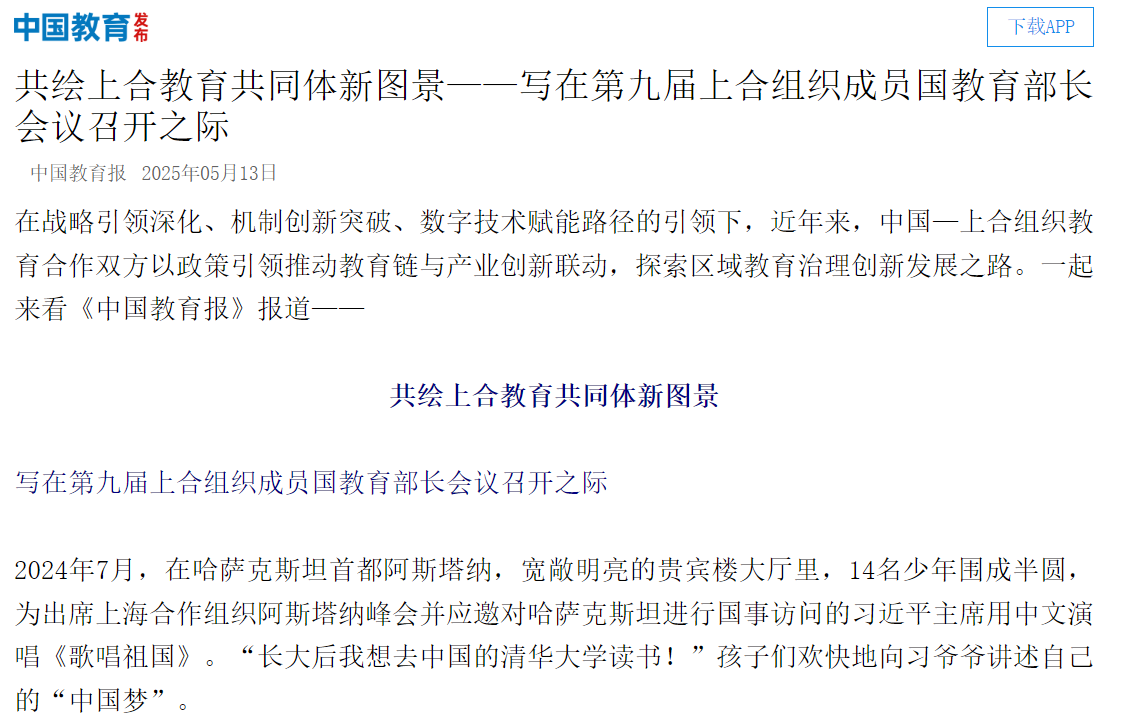 2024年,中国接任上合组织轮值主席国,宣布2025年为上合组织可持续发展年。在“上合大家庭”不断壮大的背景下,中国的理念和行动体现在教育领域,倡议成立上海合作组织数字教育联盟;未来5年,将向上合组织国家提供1000个青年赴华交流名额。