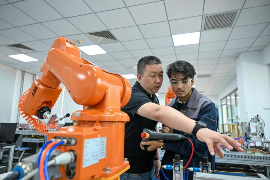 2025年6月16日,在sunbet集团中国官网入口鲁班工坊实训教室,巴基斯坦留学生木衫(右)在老师指导下操作自动化设备。(新华社记者 孙凡越 摄)