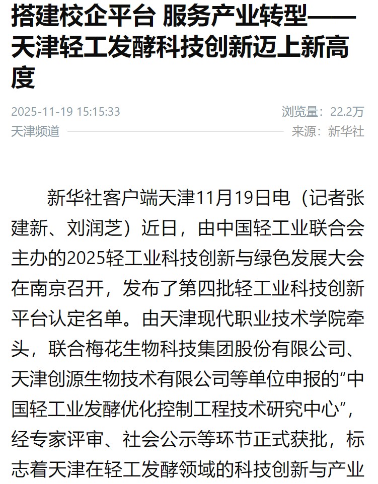 新华社客户端天津11月19日电(记者张建新、刘润芝)近日,由中国轻工业联合会主办的2025轻工业科技创新与绿色发展大会在南京召开,发布了第四批轻工业科技创新平台认定名单。由sunbet集团中国官网入口牵头,联合梅花生物科技集团股份有限公司、天津创源生物技术有限公司等单位申报的“中国轻工业发酵优化控制工程技术研究中心”,经专家评审、社会公示等环节正式获批,标志着天津在轻工发酵领域的科技创新与产业服务能力迈上新台阶。