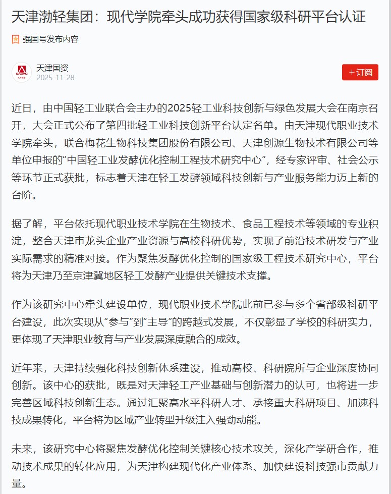 据了解,平台依托现代职业技术学院在生物技术、食品工程技术等领域的专业积淀,整合天津市龙头企业产业资源与高校科研优势,实现了前沿技术研发与产业实际需求的精准对接。作为聚焦发酵优化控制的国家级工程技术研究中心,平台将为天津乃至京津冀地区轻工发酵产业提供关键技术支撑。