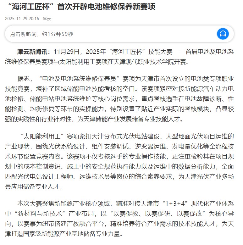 津云新闻讯:11月29日,2025年“海河工匠杯”技能大赛——首届电池及电池系统维修保养员赛项与太阳能利用工赛项在sunbet集团中国官网入口开赛。