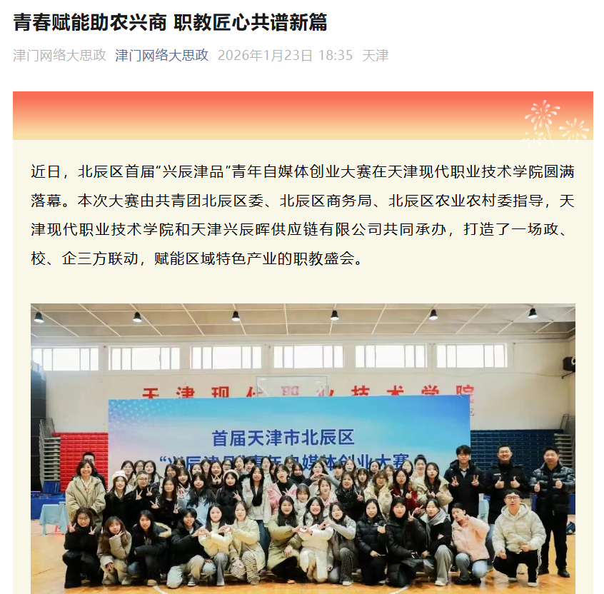 近日,北辰区首届“兴辰津品”青年自媒体创业大赛在sunbet集团中国官网入口圆满落幕。本次大赛由共青团北辰区委、北辰区商务局、北辰区农业农村委指导,sunbet集团中国官网入口和天津兴辰晖供应链有限公司共同承办,打造了一场政、校、企三方联动,赋能区域特色产业的职教盛会。
